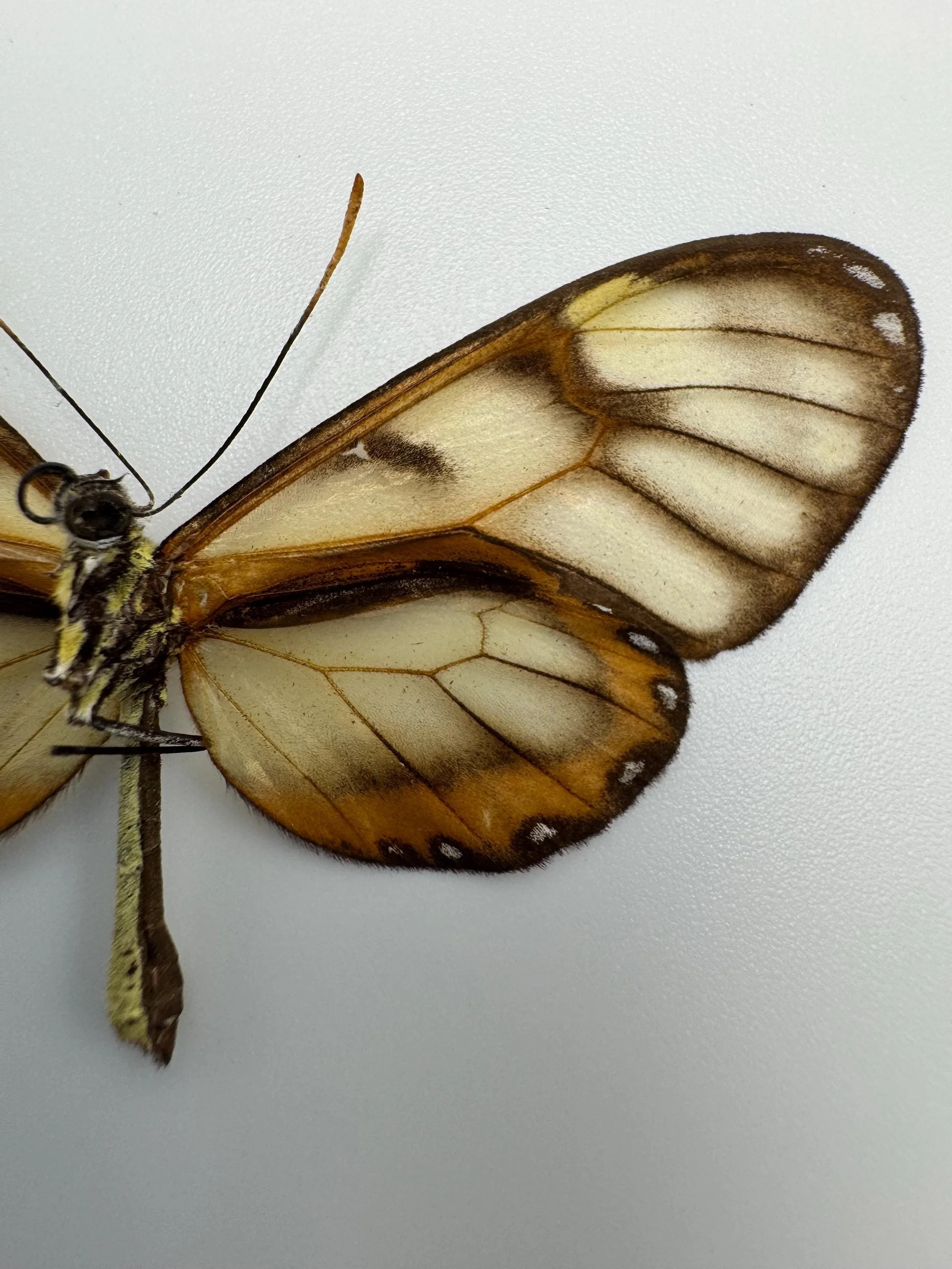 Mechanitis lysimnia is a classic South American Tigerwing species known for its subtle transparency, warm caramel coloration, and intricate mimicry patterns. Vintage specimens with confirmed 1990s data are far less common and highly appealing to both scientific and aesthetic collectors.